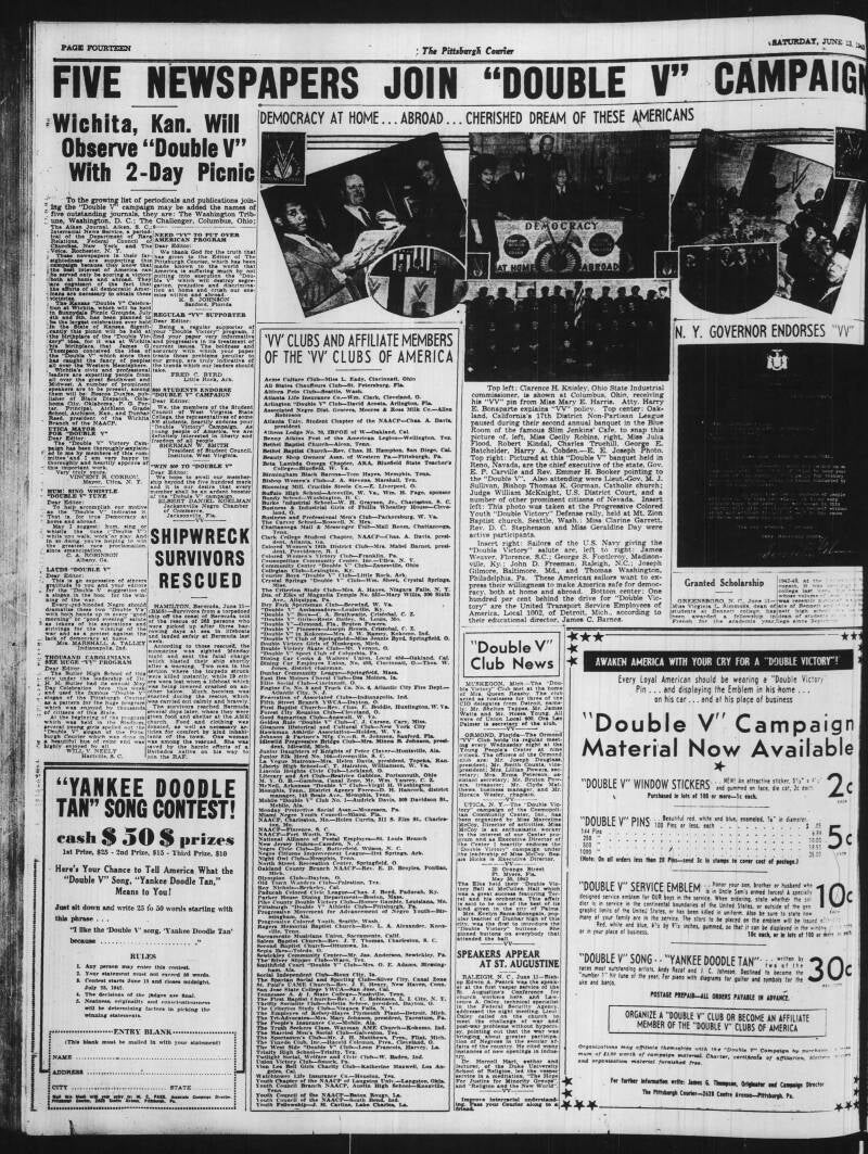 Pittsburgh Courier's Double V campaign spreads to other newspapers, resulting in more soldiers enlisting and more people supporting the war cause through purchasing war bonds. Saturday June 11, 1942